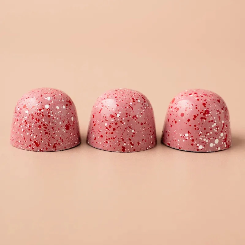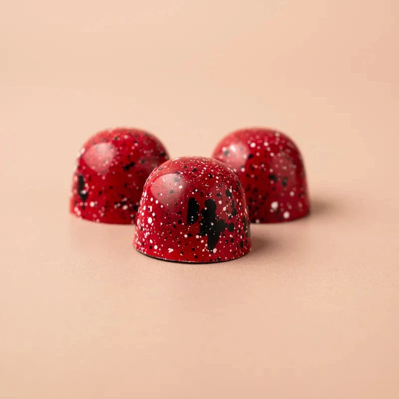 De klassieker onder de desserts, vertaald naar een verfijnde bonbon. Het frisse karakter van rijpe aardbeien vloeit samen met de zachte, romige smaak van cheesecake. Een elegante combinatie die de zoete zachtheid van witte chocolade nog verder verheft.