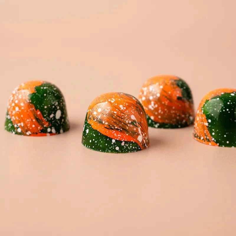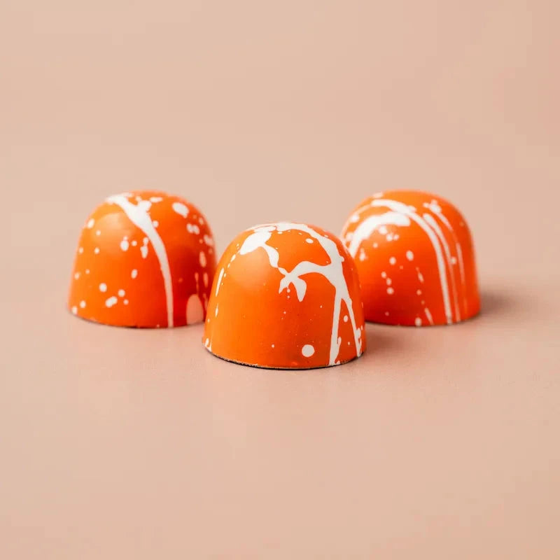 Een speelse ontmoeting van frisse sinaasappel en romige karamel met een vleugje kaneel. Omhuld door rijke pure chocolade ontstaat een verfijnde balans van sprankelende citrus en warme kruidigheid . Een lichte, elegante traktatie voor ieder moment.
